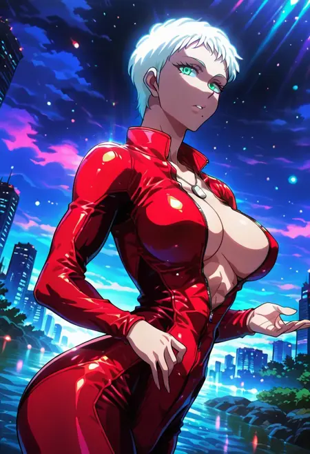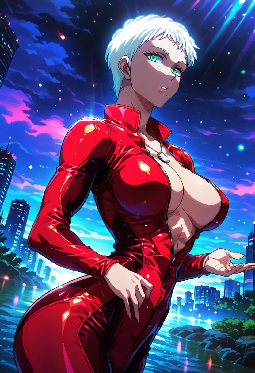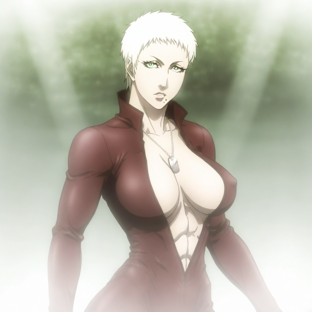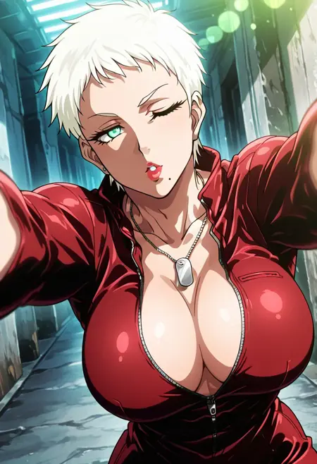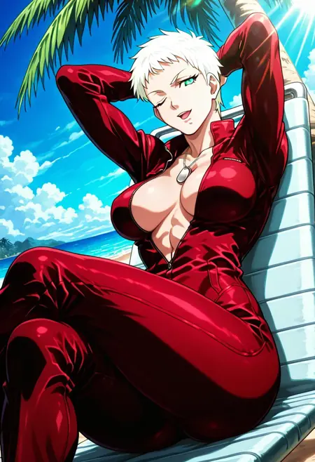 ElenaPerepelkinaTF, 1个女孩, 单人, 肌肉女性, 假小子, 短发, 白发, 水蓝色眼睛, 饱满嘴唇, 粉色嘴唇, 雀斑, 嘴下雀斑, 军牌, 红色紧身衣, 开胸紧身衣, 大胸, 厚大腿, 大屁股, 红色裤子,