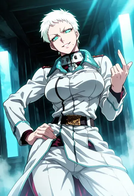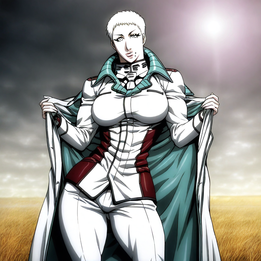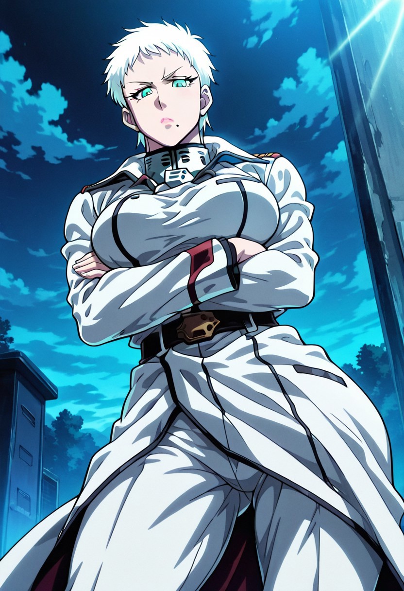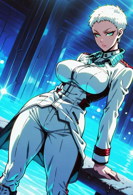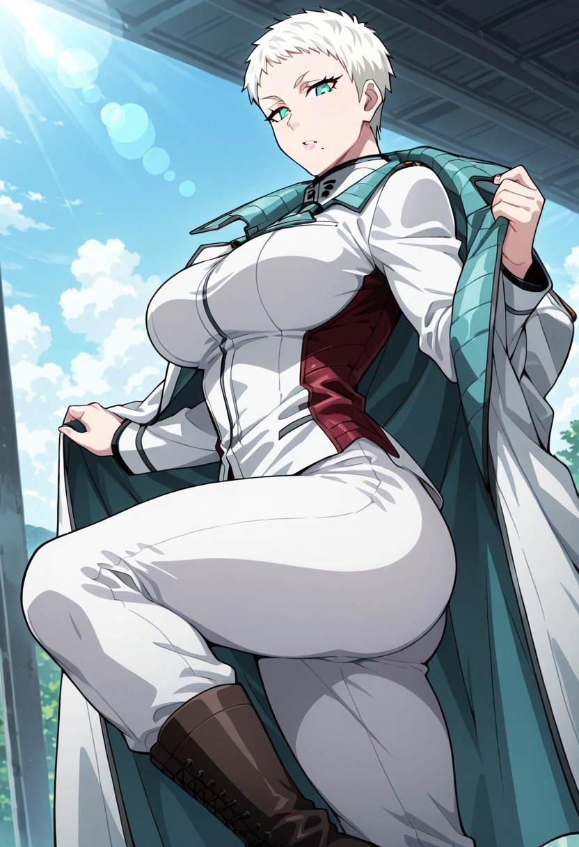 ElenaPerepelkinaTF, 1个女孩, 单人, 肌肉女性, 假小子, 短发, 白发, 水蓝色眼睛, 饱满嘴唇, 粉色嘴唇, 雀斑, 嘴下雀斑, 大胸, 厚大腿, 大屁股, 白色制服, 军装, 白色裤子, 靴子,