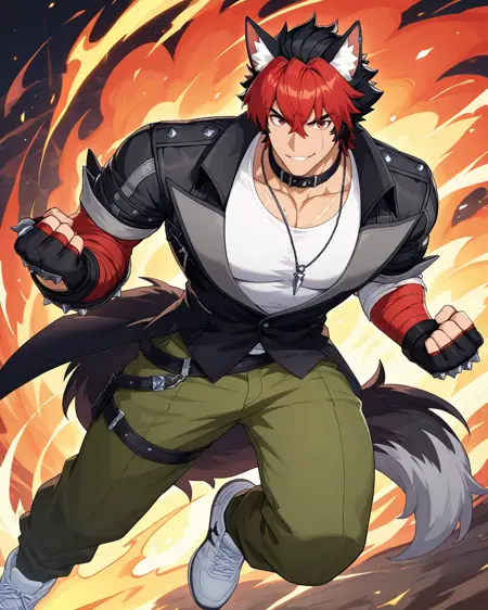 服装:手套、面部疤痕、疤痕、项链、珠宝、双色发、领子、bara、黑狼尾、胸肌沟壑、红眼、白色运动鞋、红色绷带手臂、黑色夹克、白色衬衫、裤子,