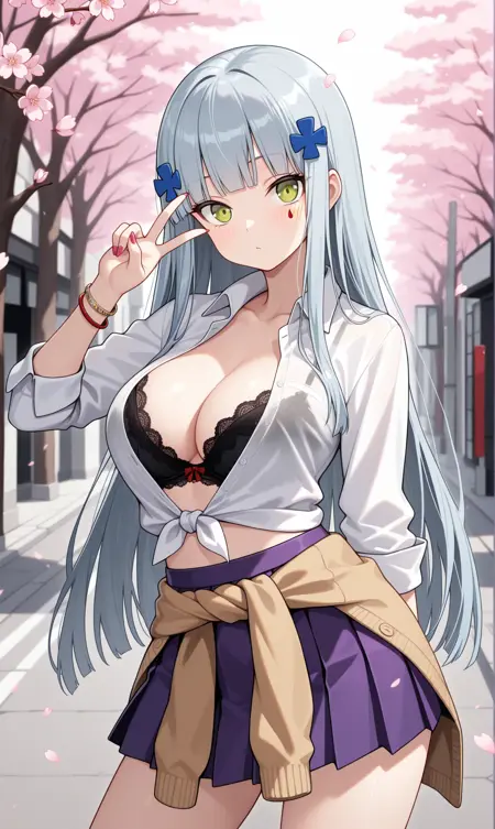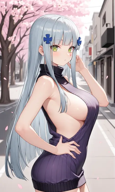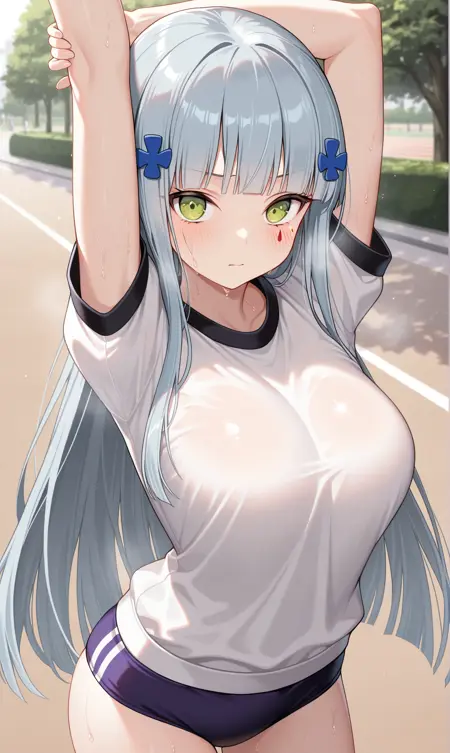 hk416 \(걸스' 프론트라인\), 둔한 앞머리, 회색 머리, 매우 긴 머리, 녹색 눈, 머리 장신구, 얼굴 문양