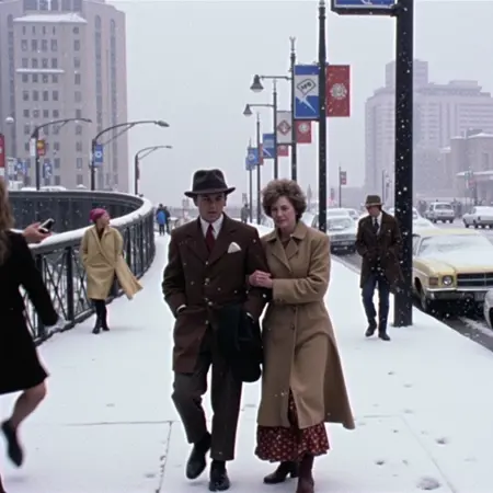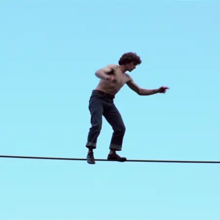 필요하다면 "70sNYC a man walking on a tightrope with his arms outstretched, against a backdrop of a clear blue sky in 1977 NYC."를 시도해볼 수도 있습니다.