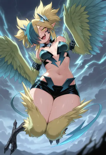 thunderbirdmge, monster girl, harpy, winged arms, feathered wings, blue wings, gradient wings, multicolored wings, green wings, pointy ears, black talons, green fur, leg fur, lightning bolt tail, blue tail, multicolored tail, electricity