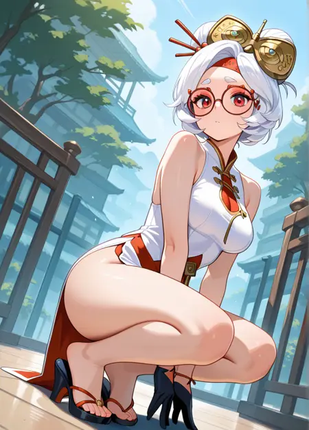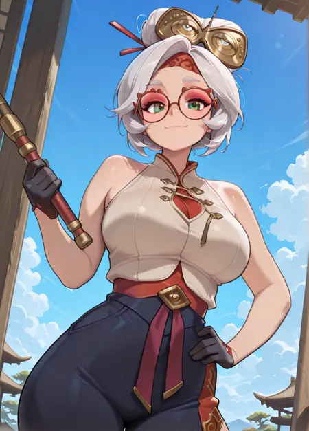 purahxd, 1girl, solo, glasses, white hair, red eyes, hair ornament, round eyewear, red lips, makeup, hair stick, red-framed eyewear,