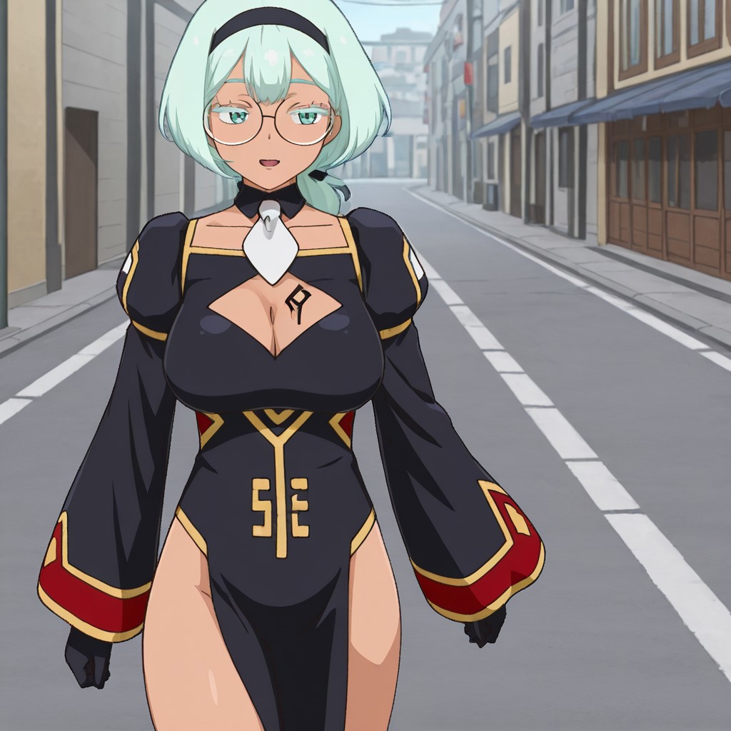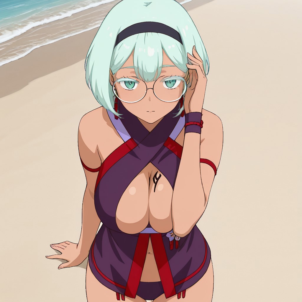 1girl,solo,Neia E Pique,green eyes,light green hair,glasses,large breasts,