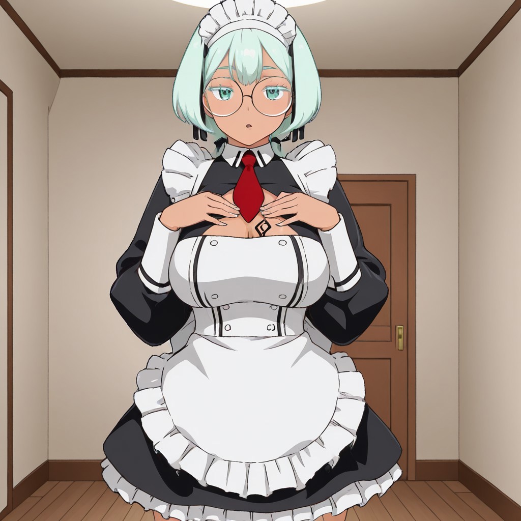 maid,maid headdress,short red necktie,black bow,cleavage,