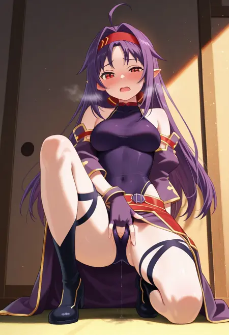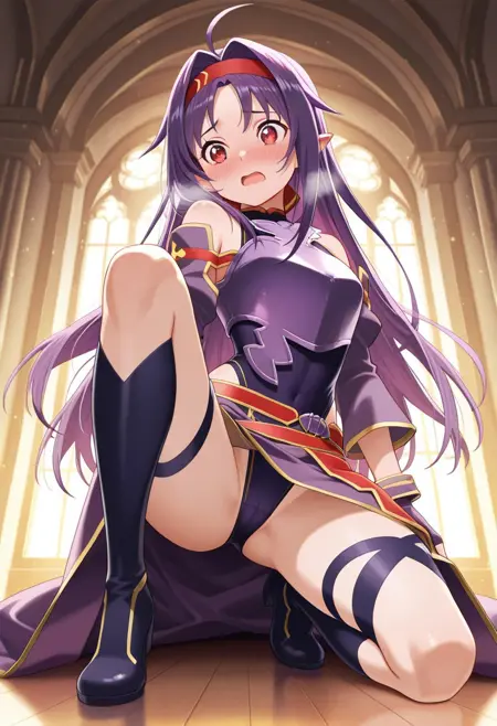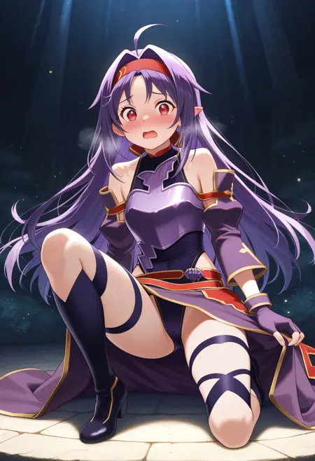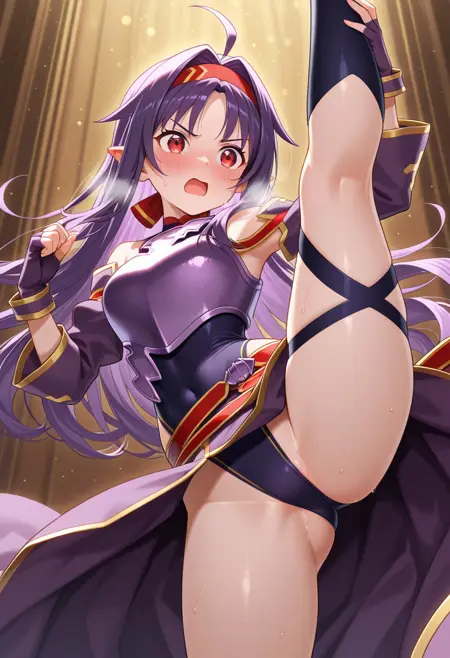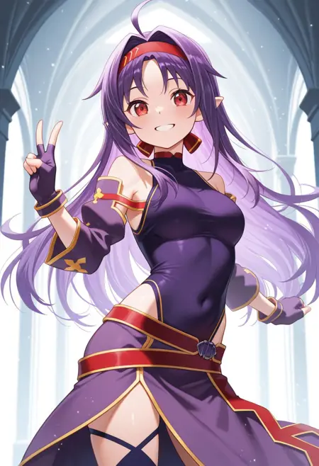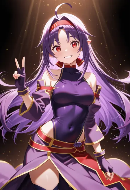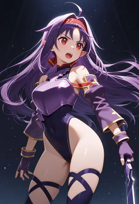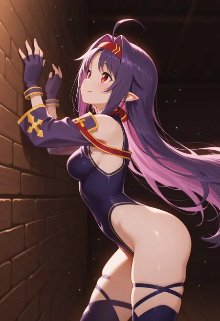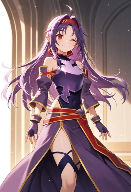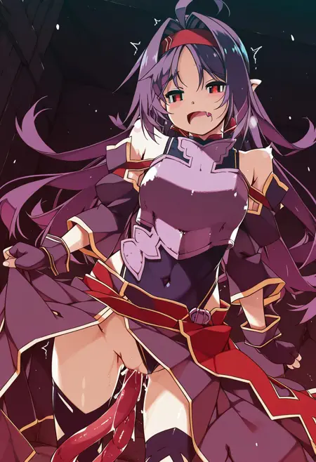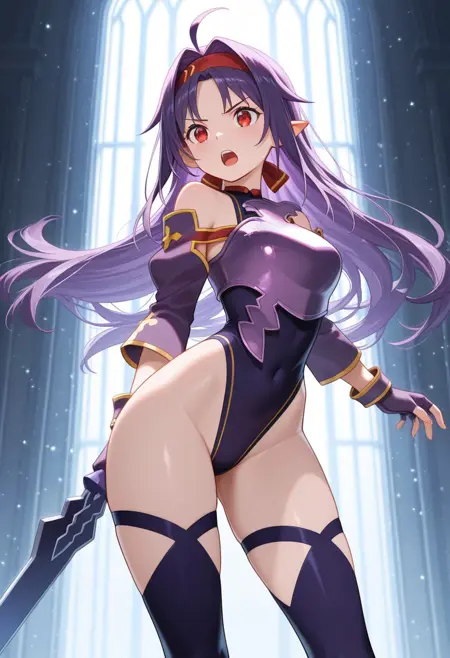 1girl, solo, YuuKonnoSAO, purple hair, very long hair, hair intakes, red hairband with yellow stripes, red eyes, pointy ears, purple leotard with gold trim, purple breastplate, bare shoulders, detached sleeves, purple sleeves with gold trim, red sleeve ribbons with gold trim, purple fingerless gloves with gold trim, red belts with gold trims, red waist ribbon with gold trim, leotard under clothes, highleg leotard, long purple skirt with gold trim, side slit, purple thighstraps, purple thighboots with gold trim