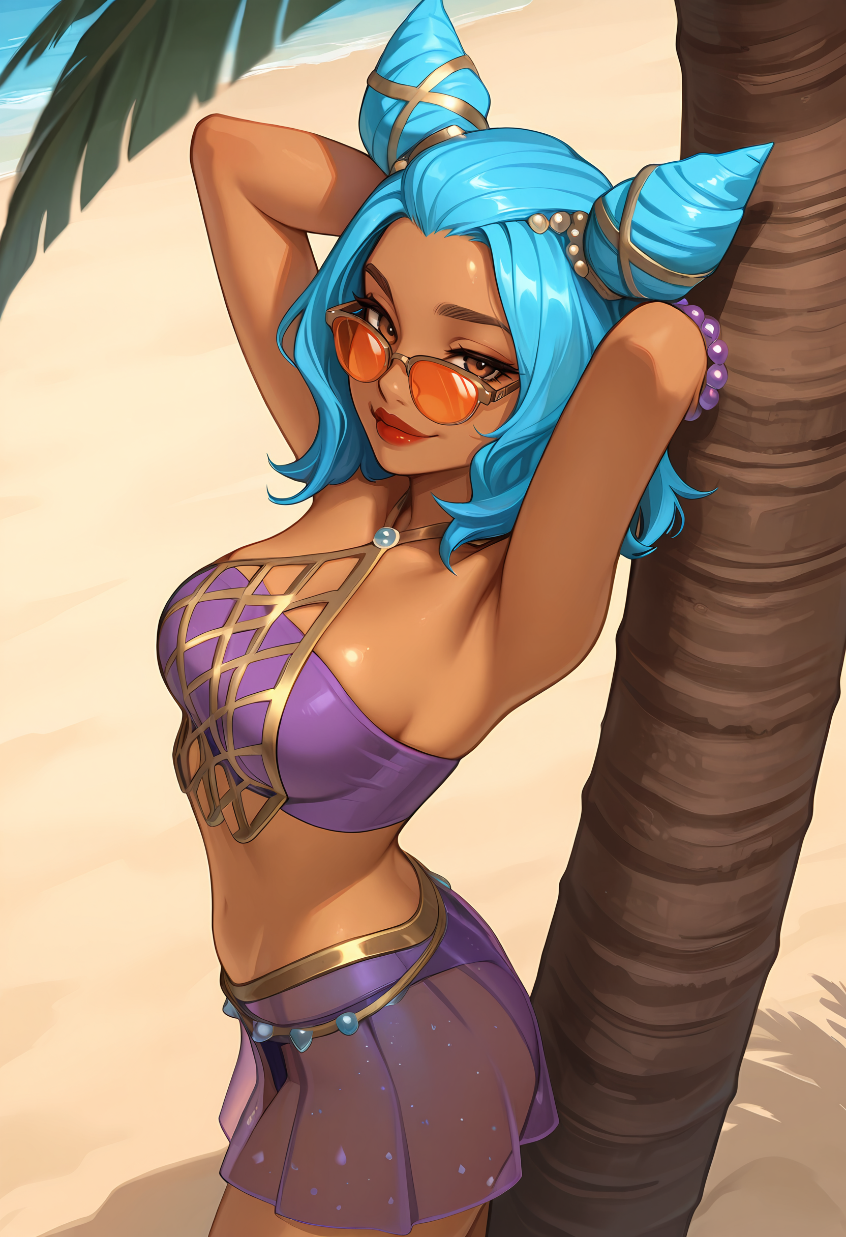 oszeriil, 중간 크기 유방, 갈색 눈, 파란 머리, 원추형 머리 땋기, 더블 땋기, 중간 길이 머리, 검은 피부 여성, 주황 톤 안경, 안경 위로 바라보기, 보라색 비키니, 밴도, 구슬, 구슬 팔찌, 반투명 치마, 어깨 노출, 허리 노출, 스트랩리스, 붉은 입술,