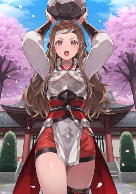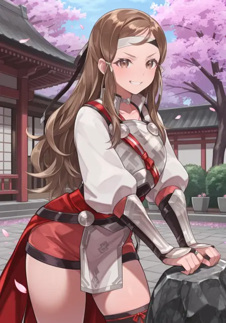 華麗:HanaRES、髪のリボン、ヘッドバンド、チョーカー、胸当て、腕甲、腰のカーテン、赤いショートパンツ、片方の黒いハイソックス、すね当て、黒いサンダル、剣