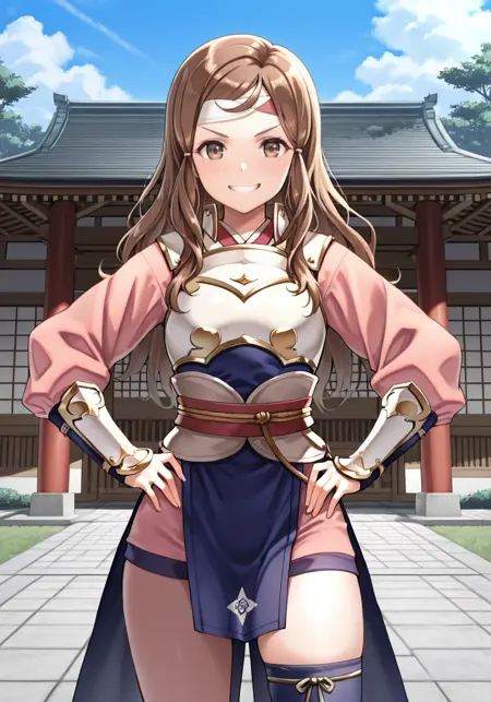 デフォルト:HanaOG、ヘッドバンド、日本の衣装、鎧、腕甲、青い骨盤カーテン、片方のハイソックス、すね当て、サンダル、刀