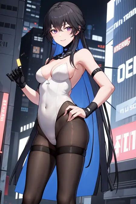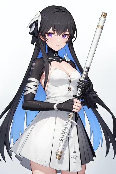 要生成该角色,请输入:“lora:SelenaPGR:strengthselenapgr, white dress, mechanical collar, black footwear, two-tone long hair, detached sleeve, bandaged arm, mechanical arm, hair ornament, chest flower, holding white flute, thigh strap,”。她的黑色裙装最终造型可通过以下提示生成:“lora:SelenaPGR:strengthselenapgr, black dress, mechanical collar, black footwear, two-tone long hair, detached sleeve, mechanical arm, bandaged arm, hair ornament, pantyhose, thigh strap,”。