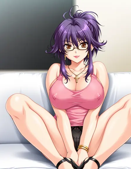 takashima miyu, purple hair, short ponytail, sidelocks, ahoge, brown eyes, brown glasses, under-rim eyewear, lipstick, cross necklace, earrings, gold bracelet, lab coat, pink tank top, blue pants, black heels, sandals