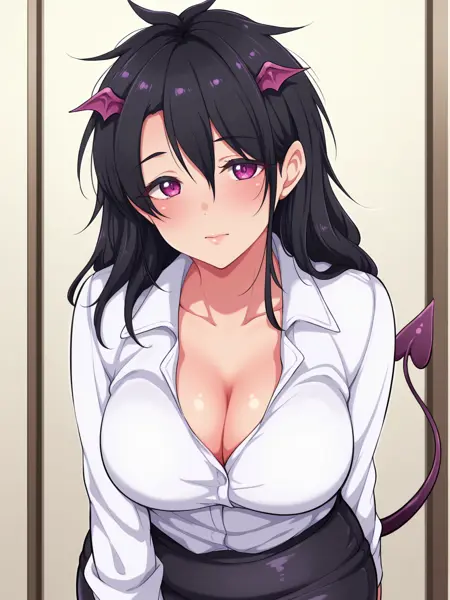 Apperance (succubuss): morieri, black hair, long hair, messy hair, purple eyes, demon tail, medium breasts, mature female, bat wing hair ornament