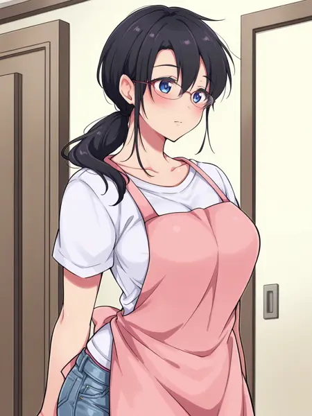 Apperance (human): morieri, black hair, long hair, ponytail, blue eyes, medium breasts, mature female, glasses