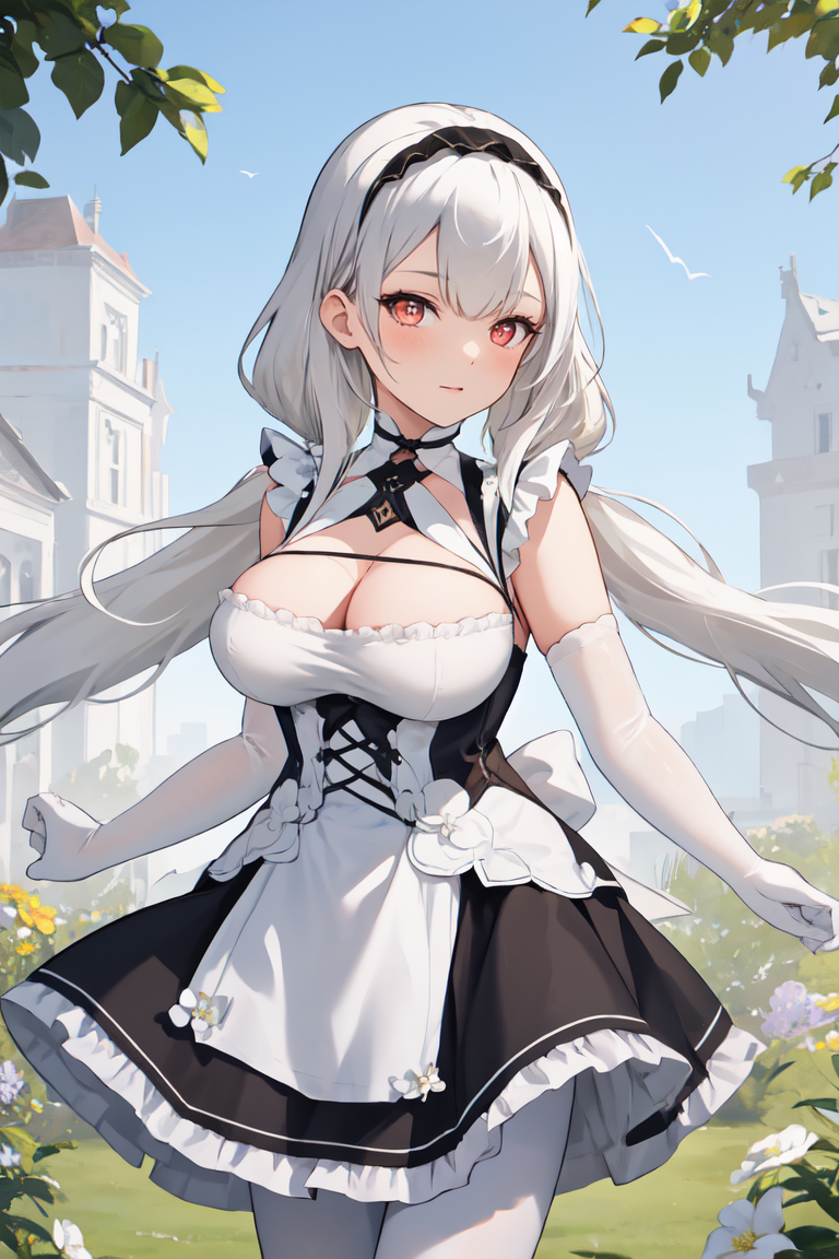 기본값: 메이드, 헤어밴드, 메이드 앞치마, 프릴 드레스, 땋은 머리, 머리장식, 낮은 트인테일, 젖가슴 절개, 흰색 팔 장갑, 흰색 팬티스타킹, 꽃, 긴 머리