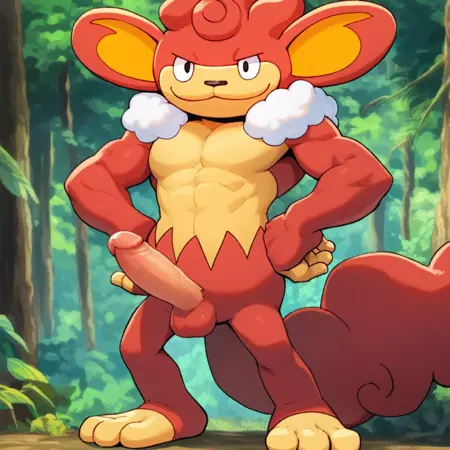 pokemon (creature), monkey, red and tan fur, black eyes, black nose, large ears, tan fingers, tan toes, fluffy tail, fluffy shoulder ruffs,