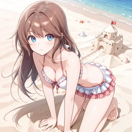 Swim: frilly bikini top, Frilly bikini skirt, Sandals)