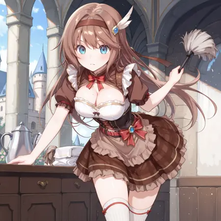 Alternative: Brown Headband with bow, corset, cleavage, brown skirt, white socks, brown boots