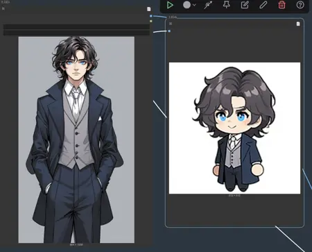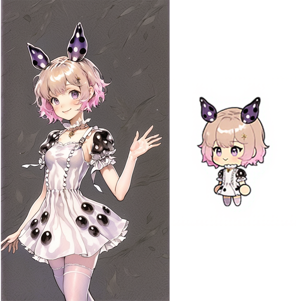 推奨プロンプト:segment and Turn the character in this image into a minimalist-anime-style chibi sprite, simple white background, full body, chibi,simple standing pose, A pose, big head with short body and big hands