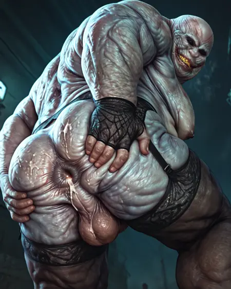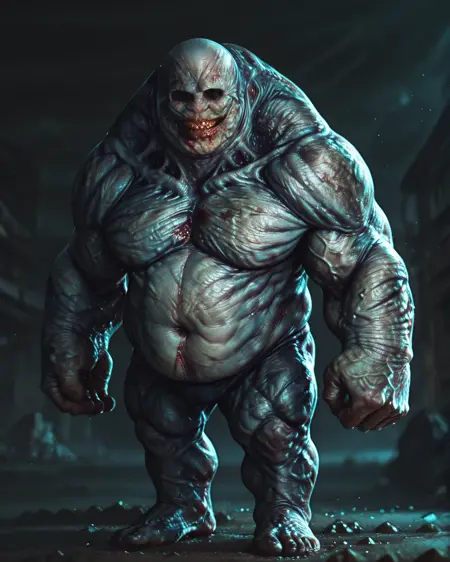 monster, no human, gigantic, grey skin, ugly skin, ugly appearance, protruding belly, deformed body, black eyes, bald, muscular