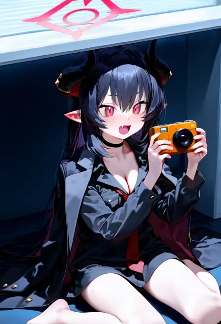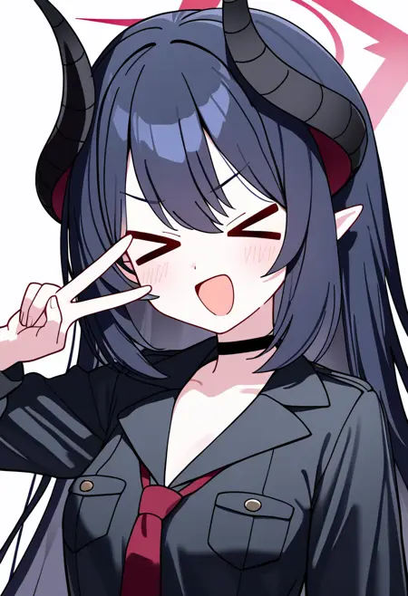 chiaki \(blue archive\), horns, long hair, halo, black hair, demon horns, red eyes, pointy ears, hair between eyes, black choker, demon girl