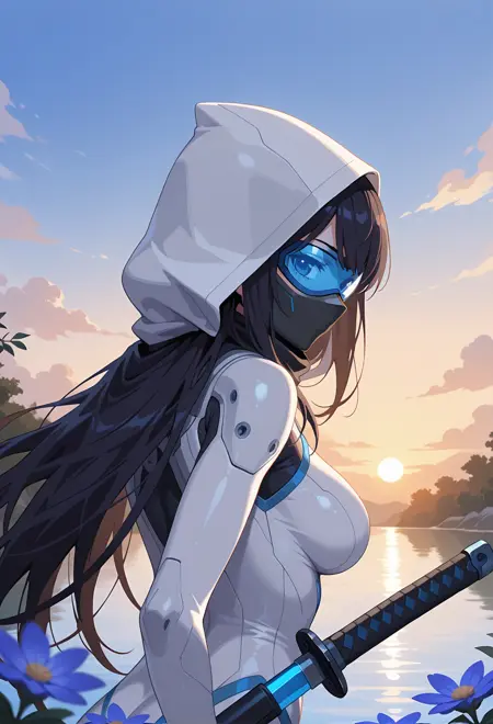 • hood_up, white_bodysuit, blue sky goggles, dark_grey ninja mask, thigh_strap, high heel footwear,