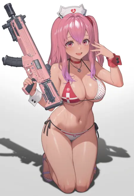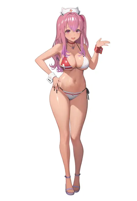水着,ビキニ,帽子,看護師帽,へそ,サンダル,サイドタイビキニパンツ,チョーカー,手首の cuffs,白いビキニ,裸の肩,赤いチョーカー,ツートーンビキニ,ドット柄ビキニ,パープルのサンダル,ツートーン手首の cuffs,赤い手首の cuffs,白い手首の cuffs,太もも,ネックレス,ハートネックレス