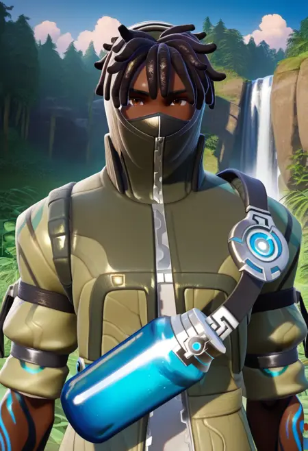 Trace_default, 갈색 눈, 짙은 피부, 운동적인 체형, 은색 귀걸이, 팔과 다리에 빛나는 네온 파란색 문신, 짧은 검은 다프락, 빛나는 파란색 캔터가 달린 유틸리티 벨트, 검은색 고자락, 수염, 빛나는 파란색 액센트가 있는 녹색 퓨처리스틱 트렌치코트, 찢어진 끝이 있는 흰색 셔츠, 찢어진 코트 끝, 말아 올린 소매, 은색 지퍼가 있는 검은 바지, 회색 보호 장갑 부츠,