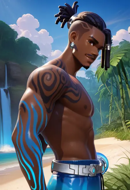 Tidewalker_Trace, 갈색 눈, 짙은 피부, 운동적인 체형, 은색 귀걸이, 팔과 다리에 빛나는 네온 파란색 문신, 은색 구슬이 달린 검은 다프락, 티ied 페니테일이 있는 언더컷, 파도 무늬가 있는 푸른 수영복, 흰색 퓨처리스틱 샌들, 빛나는 파란색 캔터가 달린 퓨처리스틱 벨트, 상체 벌벗음, 큰 검은색 고자락, 수염,