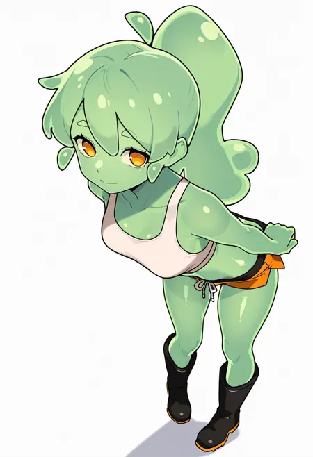 slime_cnr, 1girl, slime girl, green hair, long hair, ponytail, green skin, colored skin, orange eyes, translucent skin,
