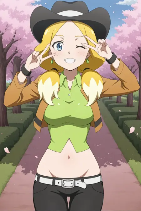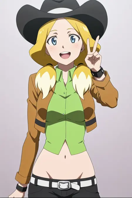의상 프롬프트: 커우보이 모자, 갈색 재킷, 녹색 셔츠, 칼라 셔츠, 크롭탑, 흰색 끈, 앞쪽 슬릿, 긴 소매, 팔찌, 흰색 벨트, 벨트 버클, 검은 바지, 커우보이 부츠, 흰색 부츠