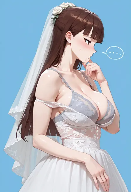 s3xy_w3dd1ng, wedding dress, bridal veil, white dress, long dress, lace dress, train (clothing), strap slip, grey bra, lace bra