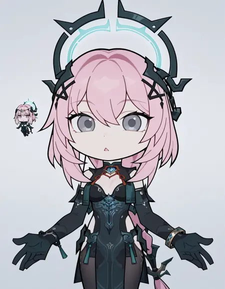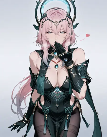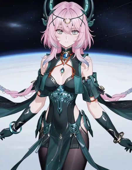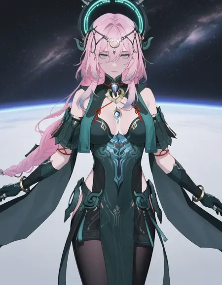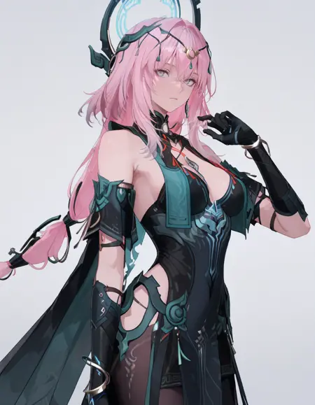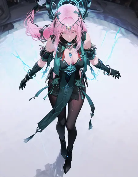 mai_pgr_Ishmael_hr_wmhs,mature female,(age_up:1.5),long_hair,dress,pink_hair,very_long_hair,hair_between_eyes,grey_eyes,multicolored_eyes,medium_breasts,headgear,halo,elbow_gloves,floating,black_pantyhose,high_heel_boots,black_footwear,tassel,pelvic_curtain,green_gloves,bracelet,jewelry,gem,holding_staff