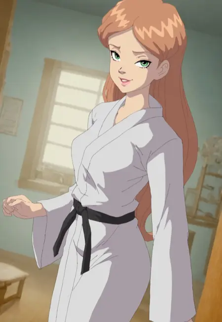 kimono, brown hair, long hair, green eyes, lipstick, white kimono, karate kimono, black belt, white pants, barefoot,
