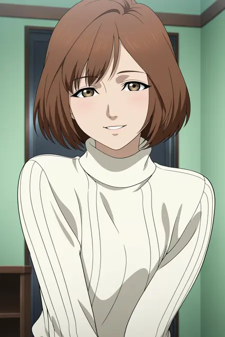 harasaki nozomi, short hair, brown hair, parted bangs, brown eyes, long sleeves, white sweater, aran sweater, turtleneck, untucked shirt, red skirt, pleated skirt, black socks, kneehighs, brown footwear, loafers