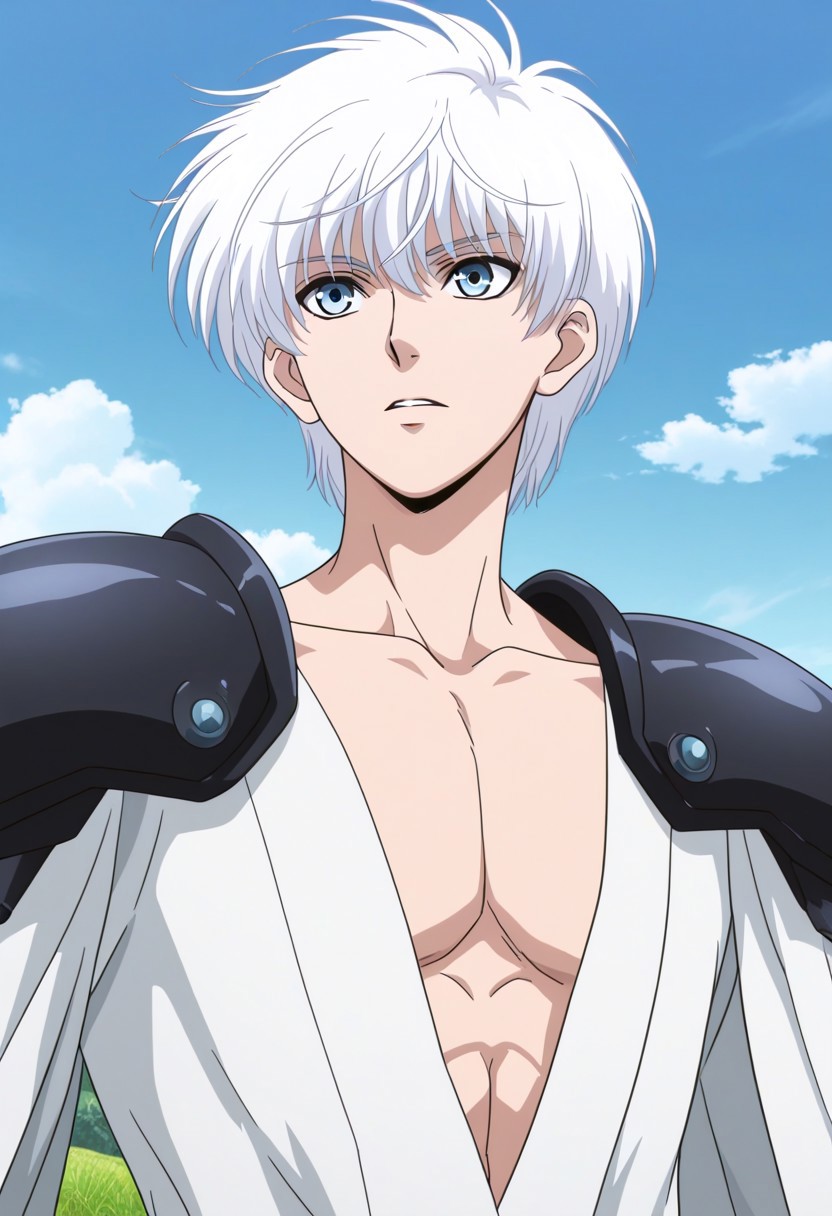 Kall-Su, white hair, light blue eyes, medieval fantasy clothing, robe, wide pauldrons, cape