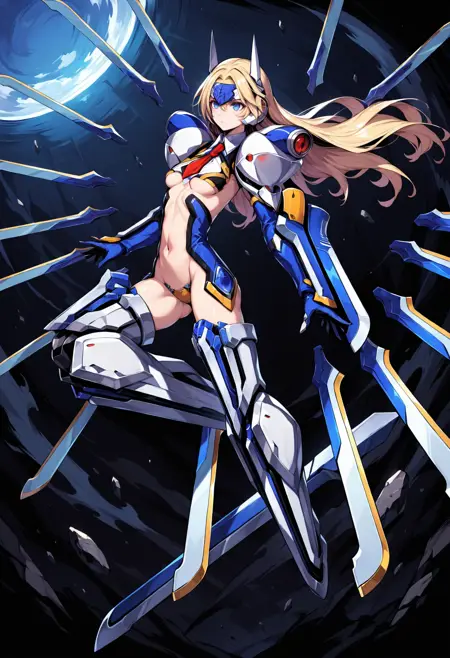 战斗形态: 胯部护甲,露出下胸,额护具,乳房,过膝袜,机械少女,靴子,手套,露肤服装,肘部手套,盔甲,机械耳,肩甲,肩部护甲,小乳房,大腿靴,蓝色鞋履,耳部防护,悬浮武器,刀刃,剑