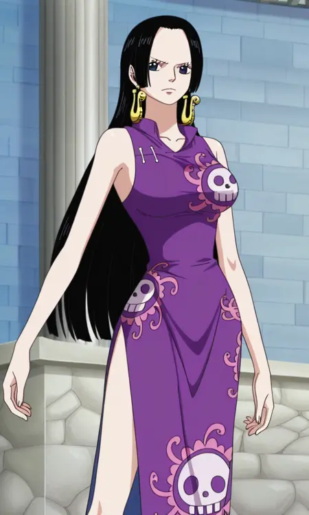 보아 해코크, 1소녀, 혼자, 검은 머리, 검은 눈, 파란 눈, 매우 긴 머리, 귀걸이, 뱀 귀걸이, 드레스, 보석, 가슴, 중국 드레스, 보라색 드레스, 큰 가슴, 중국 복장, 하이힐, 소매 없는 드레스, 소매 없음, 측면 슬릿, 어깨 노출, 긴 드레스, 큰 가슴