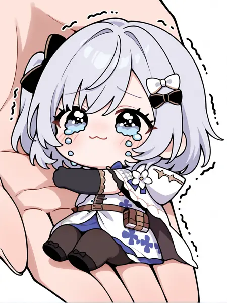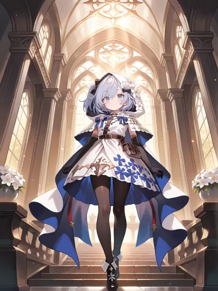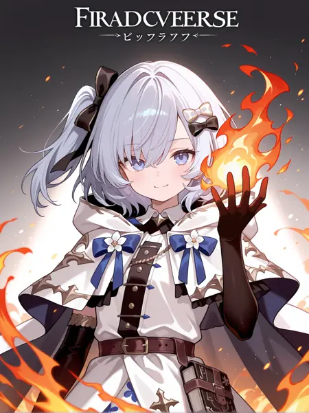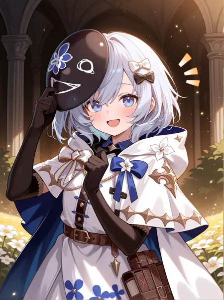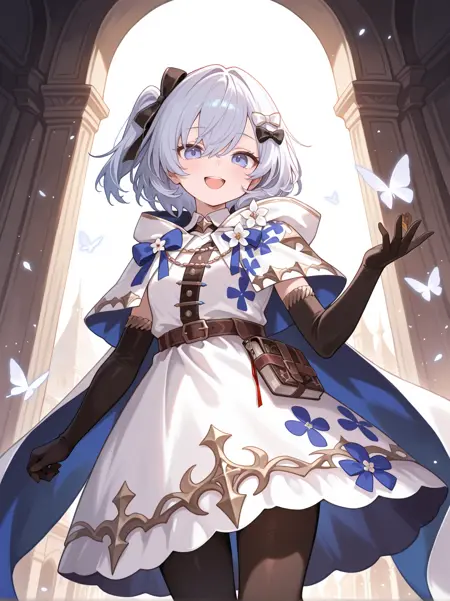 标签(服装):黑色蝴蝶结,白色带帽斗篷(红色内衬/蓝色内衬斗篷),印花连衣裙,肘部手套,花朵帽子(帽子向上/帽子向下),棕色腰带,黑色连裤袜,
