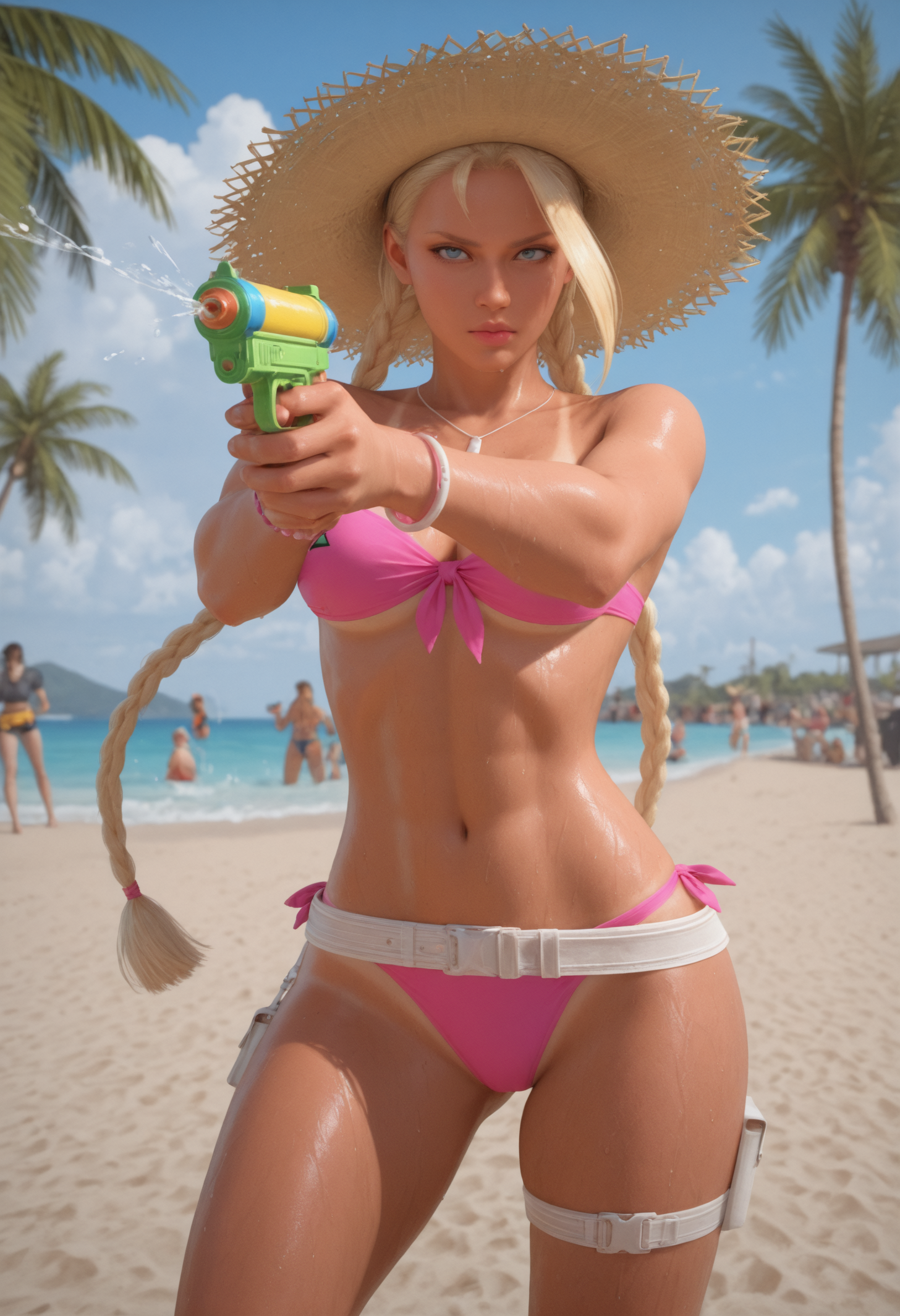 1girl, cammy white, blue eyes, tan, dark-skinned female, blonde hair, braid, twin braids, long hair, straw hat, sun hat, jewelry, tanlines, medium breasts, swimsuit, pink bikini, bracelet,