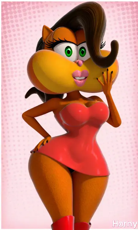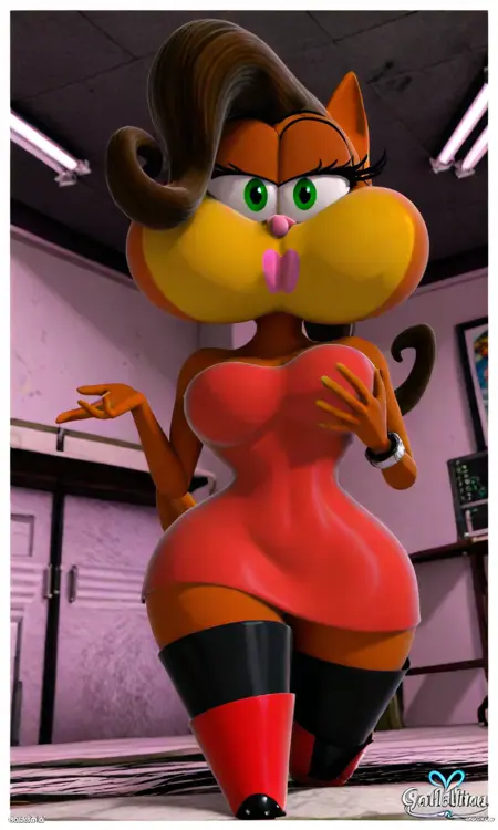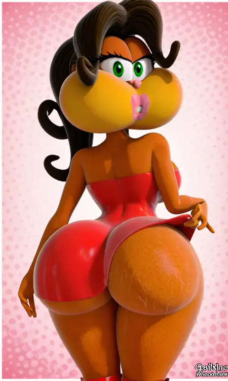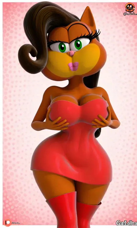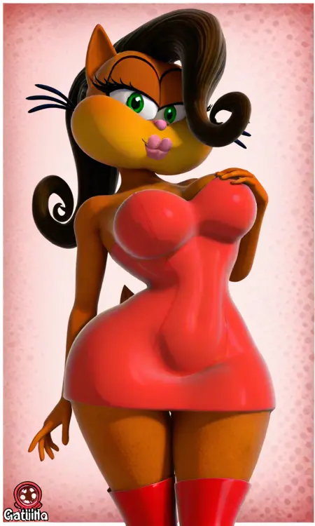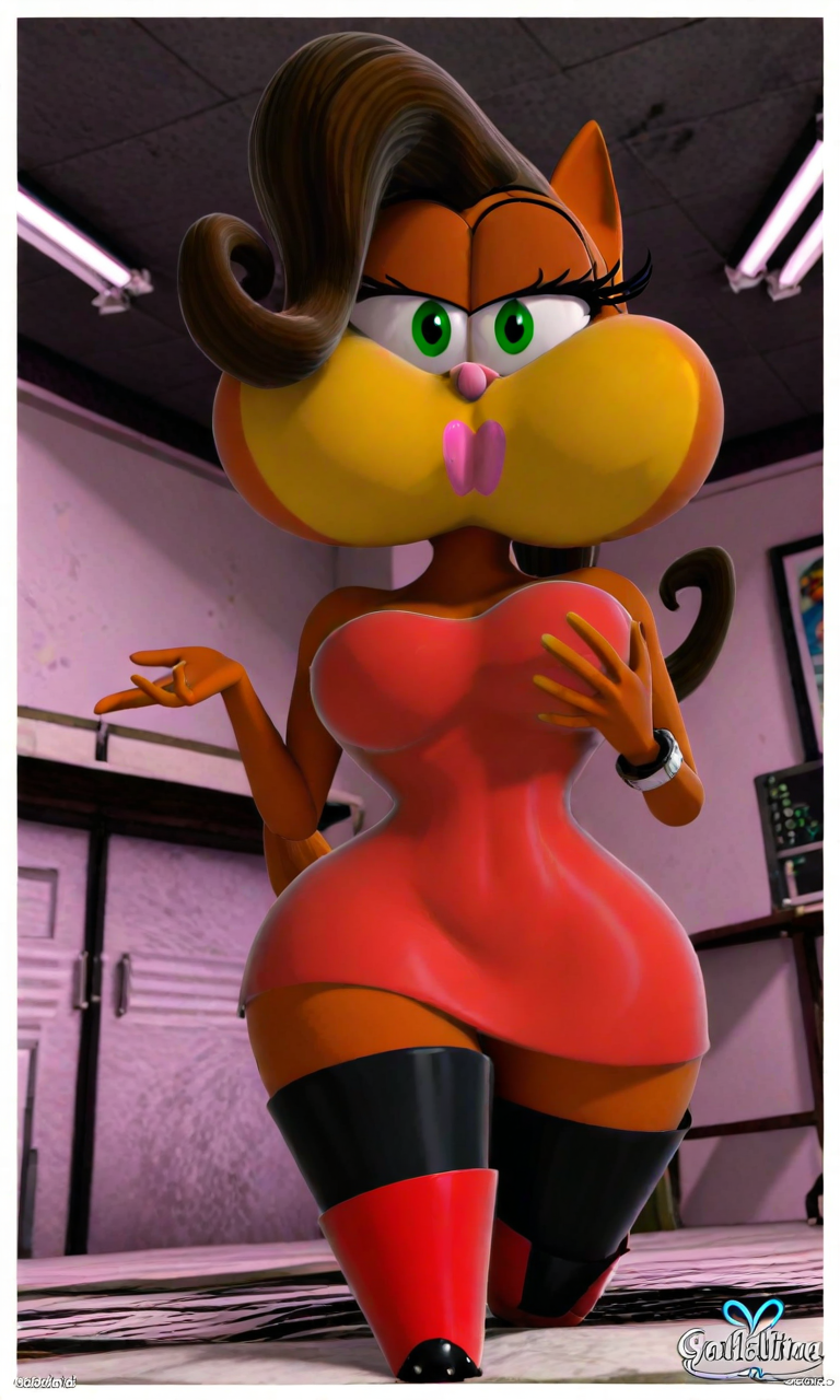 タグ: ガタリナ、緑の目、オレンジ色の体、黄色い頬、ピンクの鼻、ピンクのリップ、茶色の髪、レッドラテックスのドレス、赤いブーツ