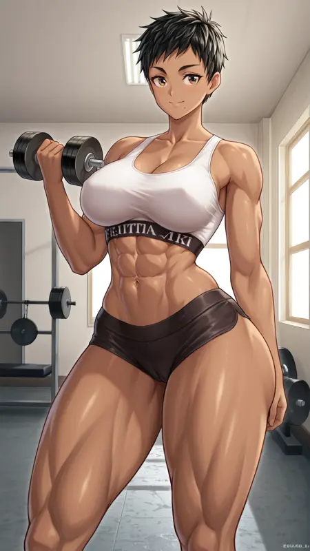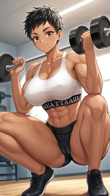 Suiko_XL, mole, single mole under mouth, very short hair, abs, muscular female, dark skin,