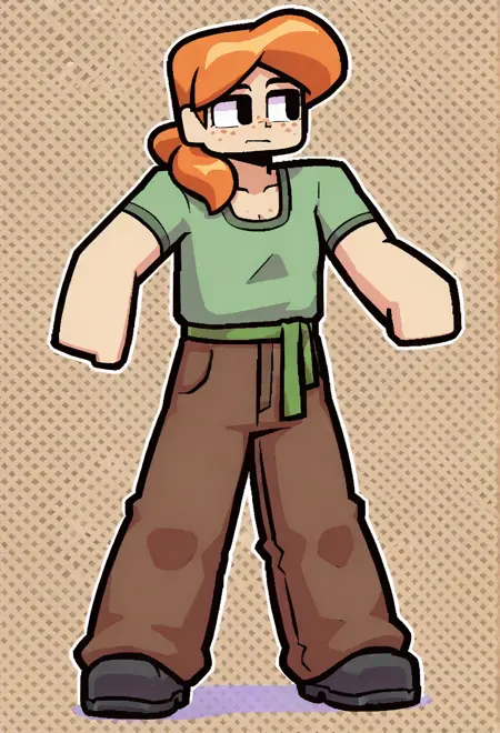 AlexDFAN, 1girl, black eyes, orange hair, long green shirt, brown pants, short sleeves, freckles, square arms, square body, green waist ribbon