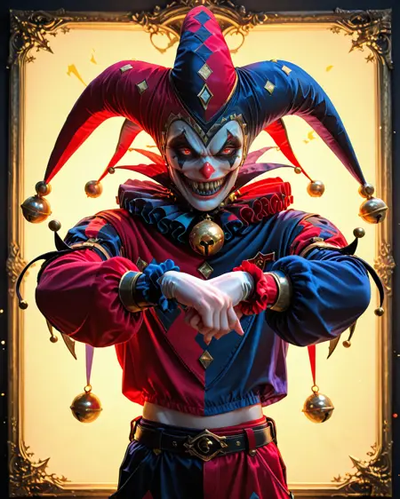 demon harlequin, peasant shirt, trousers trimmed with multi-colored diamond-shaped patches, hat with bells, light shoes, loose clothing, face paint, colored clothes, harlequin, evil clown