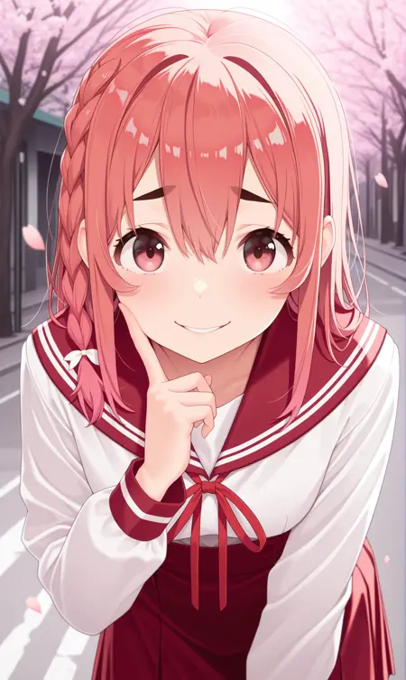 white shirt, red serafuku, red ribbon, long sleeves, red skirt, high-waist skirt, white thighhighs, loafers