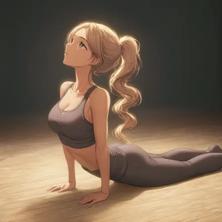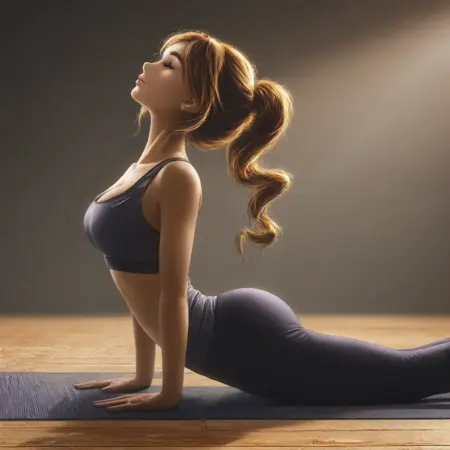 cobra pose, upward-facing pose, backbend pose, stretching pose, lying on stomach, arched back, chest forward, head raised,