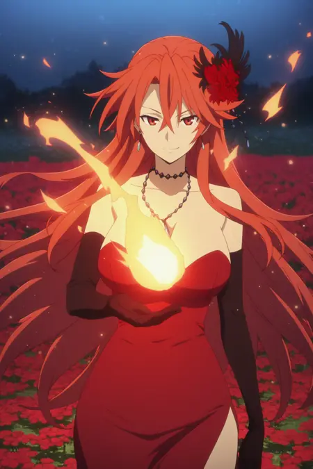 red hair, long hair, 1girl, jewelry, dress, gloves, red dress, solo, hair ornament, bare shoulders, elbow gloves, earrings, red eyes, anime coloring, hair between eyes, necklace, flower, large breasts, cleavage, hair flower, detached sleeves, very long hair, black gloves
