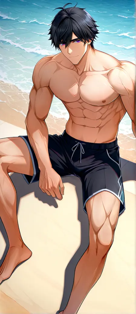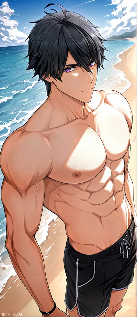 트리거 단어: croxw, 검은 머리, 보라색 눈, 근육질의 남성