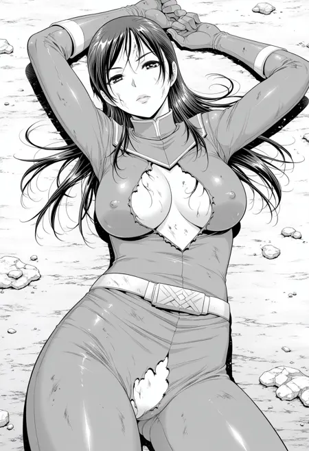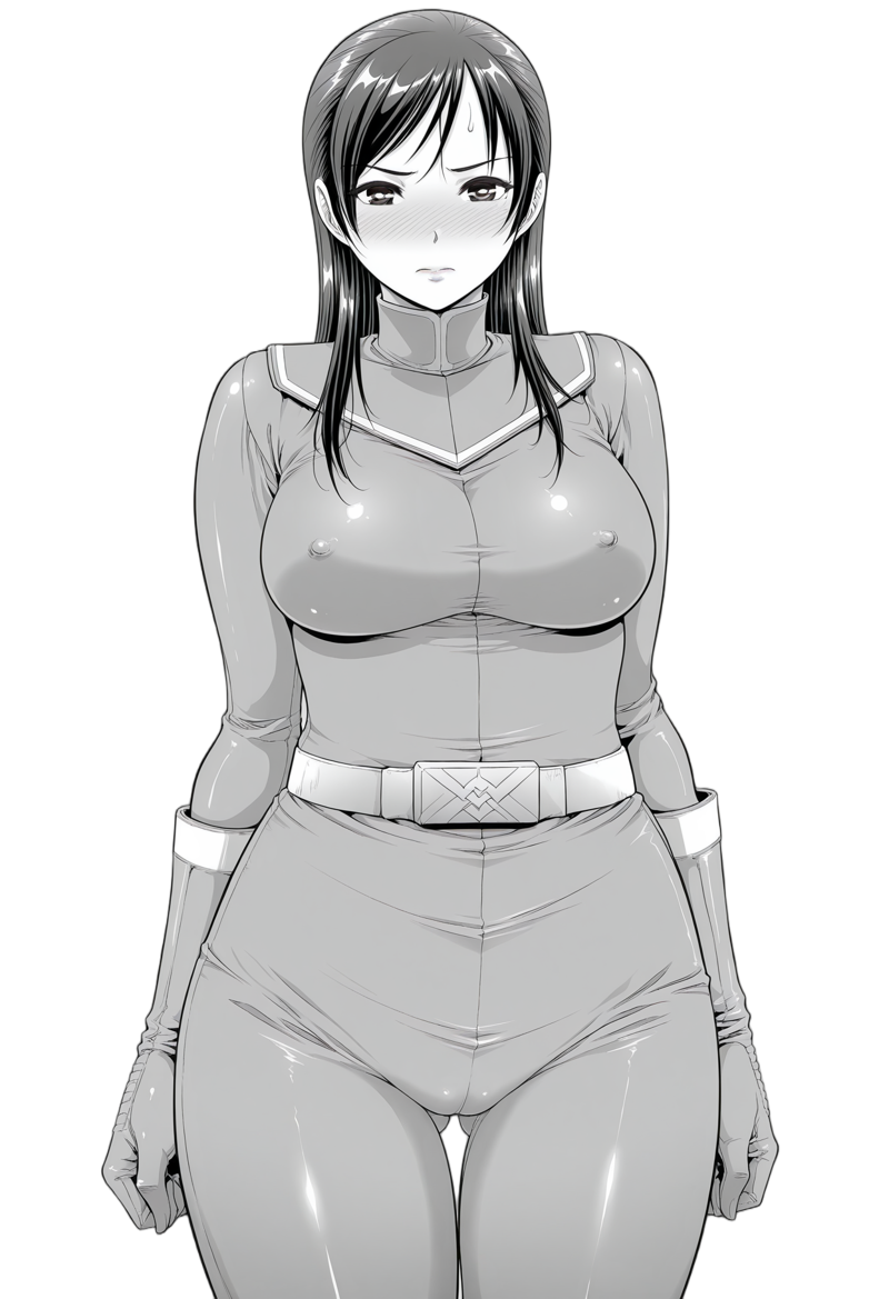 Triggerwords: monochrome, greyscale, c-tora, black hair, black eyes, long hair, large breasts, Clothing: bodysuit, belt, gloves,