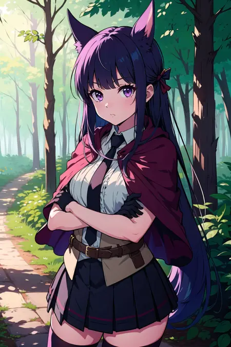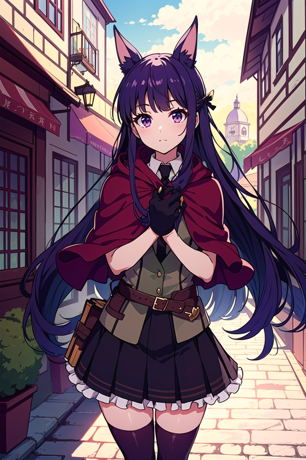 Default outfit: necktie, collared shirt, black thighhighs, vest, (red capelet:1.1), pleated skirt, frills, black gloves, belt,