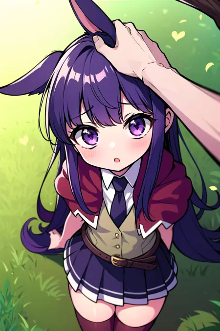 Might help: very long hair, black hair ribbon, dog_ears, purple eyes,